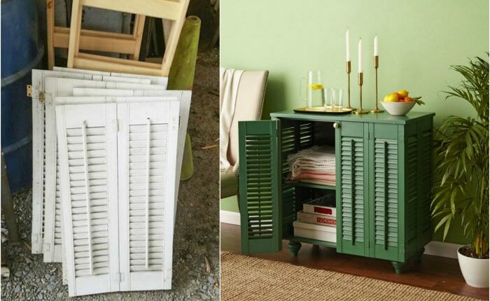 Задумали заменить ветхие деревянные ставни на даче? Не спешите отправлять их на помойку. Качественная покраска, кусок фанеры, деревянная столешница и мебельная фурнитура позволят превратить ветошь в очаровательный шкафчик.