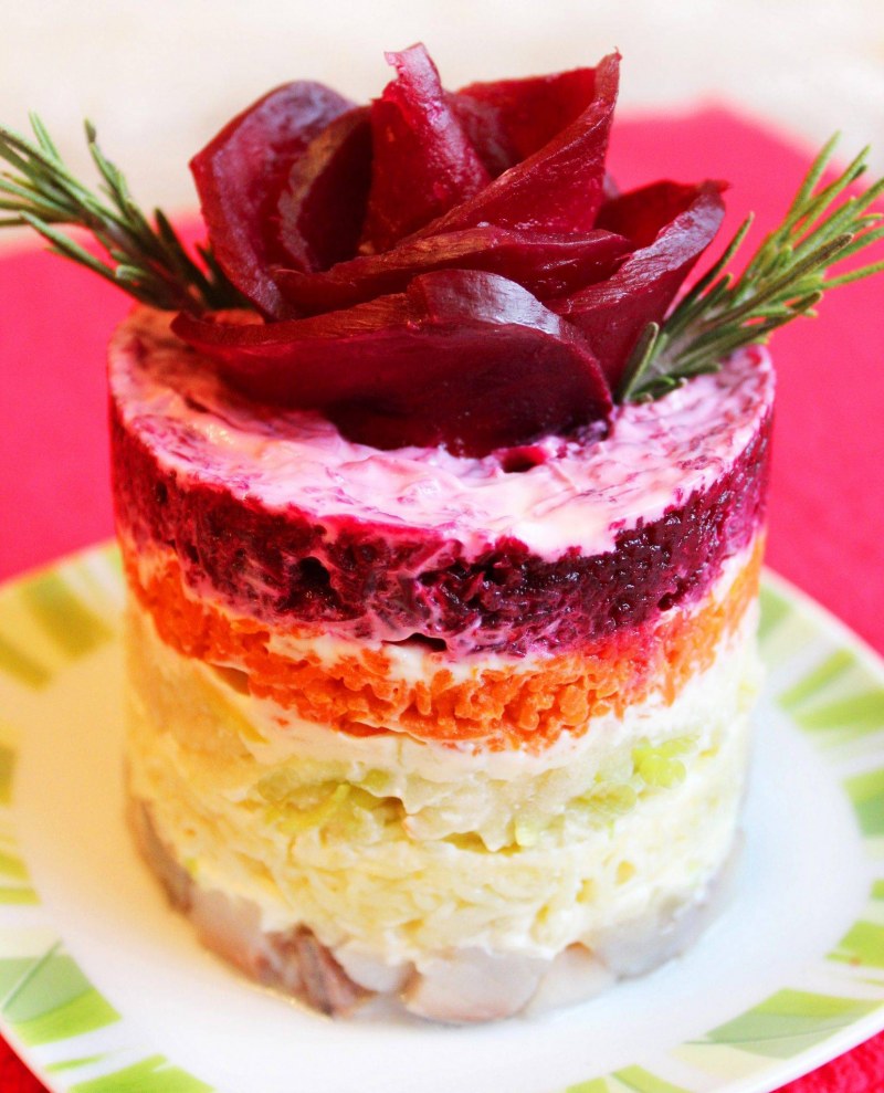 • Подача порционно. В кольцах или стаканчиках шуба выглядит аккуратно и современно.