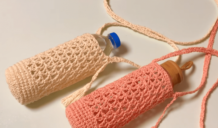 Практичный и симпатичный чехол под бутылочку с водой станет настоящей находкой. Связать его можно за какой-то час-полтора из остатков любой пряжи. При желании в переноску можно дополнить подкладкой, вырезав ее из старого термопакета или куска утеплителя, чтобы содержимое на дольше оставалось прохладным.