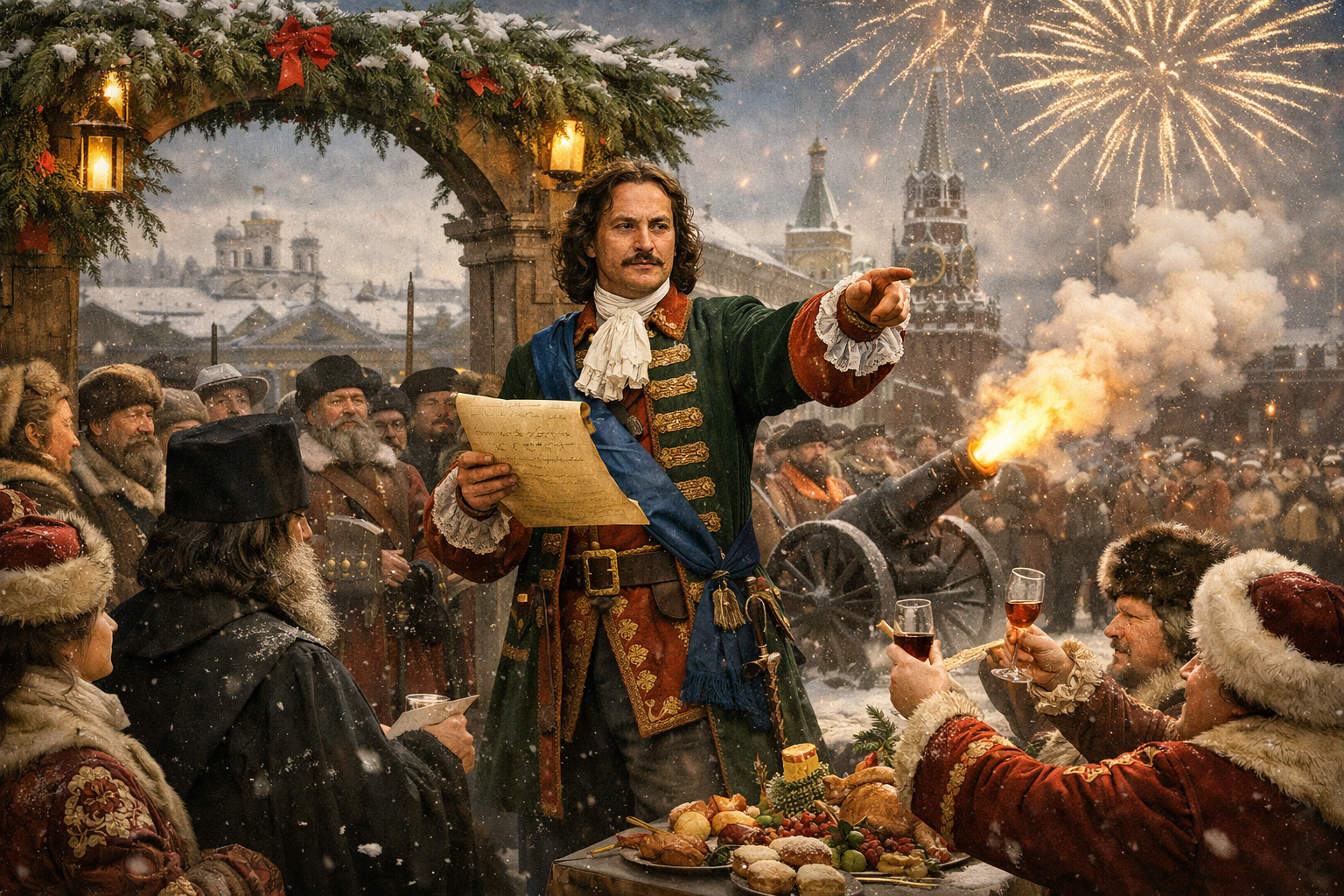 Царь, вдохновленный Европой, предписал украшать ворота домов сосновыми и можжевеловыми ветвями, палить из пушек и запускать ракеты, а знатным людям — щедро угощать гостей.