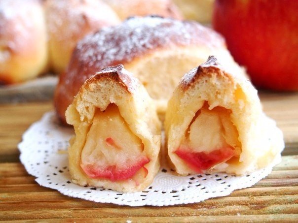 Раскатать тесто толщиной, примерно, 0,7 см. Вырезать кружки. На каждый кружок положить дольку яблока. Защипать каждую дольку яблока в кружок теста и разложить в форме для выпечки (у меня форма 26 см, по большому кругу я раскладывала целые дольки яблок, а в серединке по половинке), застеленной бумагой для выпечки и смазанной растительным маслом. Посыпать оставшимся тростниковым сахаром с корицей (если останется).