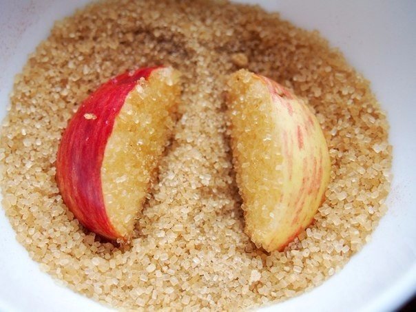 2. Тем временем тростниковый сахар смешать с корицей. Яблоки помыть, удалить сердцевину и порезать на дольки. Каждую дольку обвалять в тростниковом сахаре с корицей.