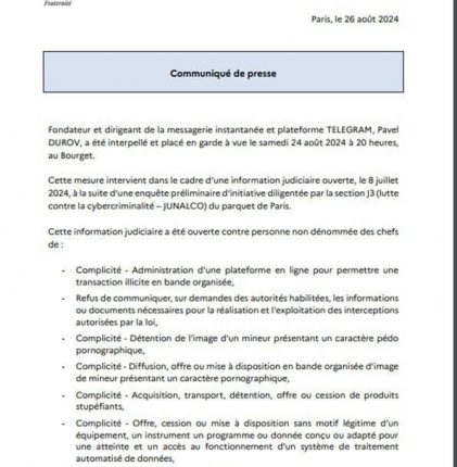 Прокуратура Парижа опубликовала пресс-релиз в связи с задержанием основателя Telegram Павла Дурова. В документе говорится, что дело было открыто 8 июля 2024 года.