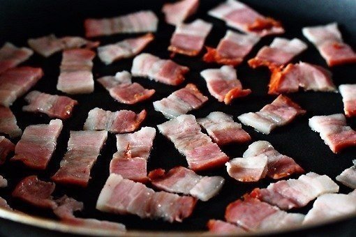 1. Подготавливаем бекон для печенья. Для этого нужно обжарить его на сковороде и нарезать небольшими кусочками.