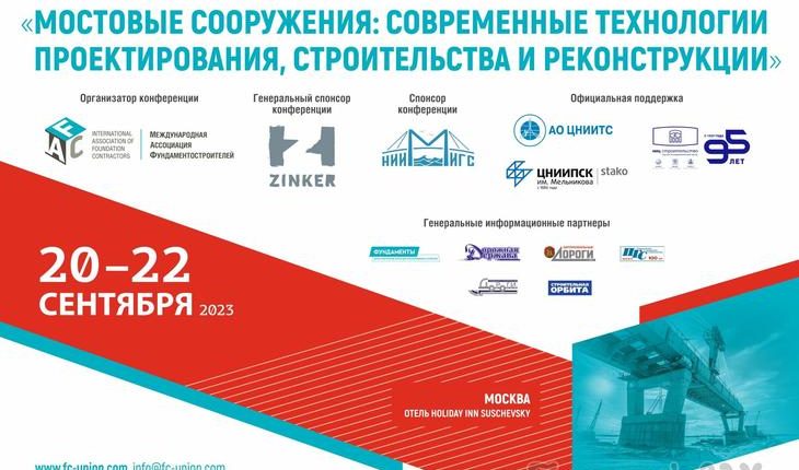 С 20 по 22 сентября 2023 года Международная Ассоциация Фундаментостроителей проведет в Москве, в пространстве отеля Холидей Инн Сущёвский (Holiday Inn Suschevsky) V международную научно-практическую конференцию «Мостовые сооружения: современные технологии проектирования, строительства и реконструкции». Кроме этого, по традиции, будет доступна к посещению выставка «Строительные материалы и технологии для мостостроения». В рамках экспозиции представители компаний — участников проведут презентации своих новинок и текущих проектов.