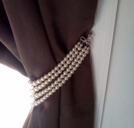 Если у вас есть бусы, которые вы давно не носите, или вы храните бусины из рассыпавшегося ожерелья, им можно подарить новую жить в лице очень выразительных подхватов для дома. Все, что нужно в данном случае – лишь нанизать бусины на крепкую леску необходимой длины и зафиксировать на крючке. Вы можете ограничиться одной лаконичной ниткой или сочетать сразу несколько, чтобы создать более эффектную композицию.