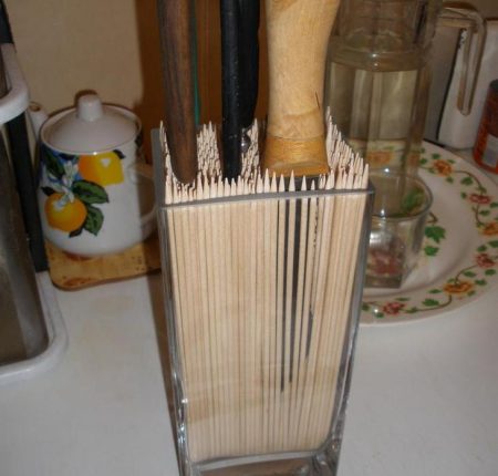 Итак, что можно использовать в качестве самодельной подставки для кухонных ножей? Во-первых, вам понадобиться какой-то контейнер — банка, жестяная коробка, деревянный высокий ящичек и тому подобное. Во-вторых, наполнитель, куда вы сможете просто втыкать ножи. Самые распространённые варианты наполнителя: