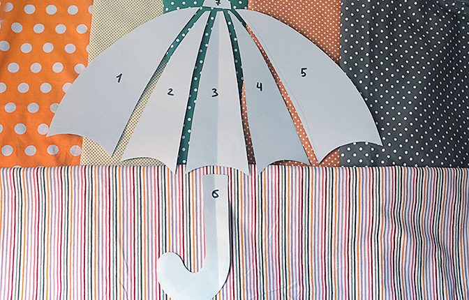 Перенесите рисунок зонта, который можно бесплатно, на бумагу и увеличьте до нужного размера. Разложите выкройки на отрезы ткани. Мы использовали 5 разных тканей в горошек для самого зонтика и ткань в полоску для ручки и боковых частей.