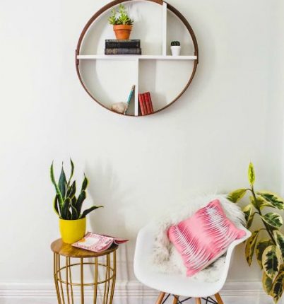 Оригинальная круглая полка, окантовка которой сделана из тонкого ДВП, а сами полки из обыкновенной доски, покрашенной в белый цвет. Конечно, такая конструкция не подойдет для хранения всей домашней библиотеки, однако сможет вместить несколько учебных книг, небольшое комнатное растение и пару снимков в рамке.