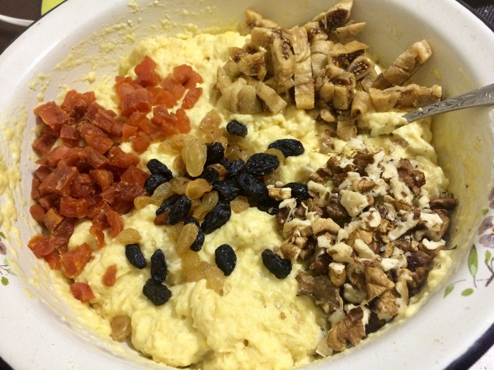 Добавьте в тесто измельчённые орехи и сухофрукты — по вкусу. Можно немного предварительно замочить изюм или порезать курагу.