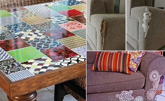 Потертости и разрывы текстильной обивки старого, но любимого дивана, можно скрыть с помощью латок из ажурной ткани или красивых кружевных салфеток.