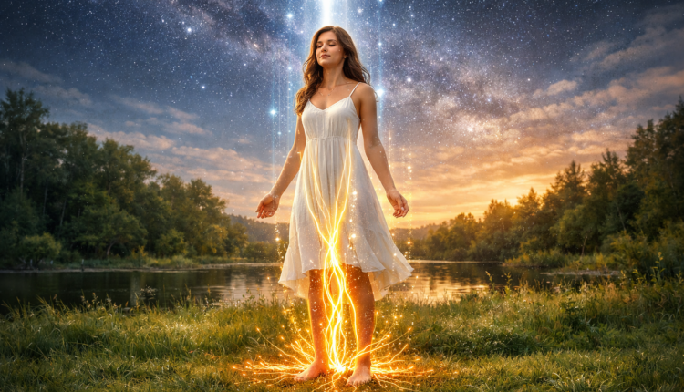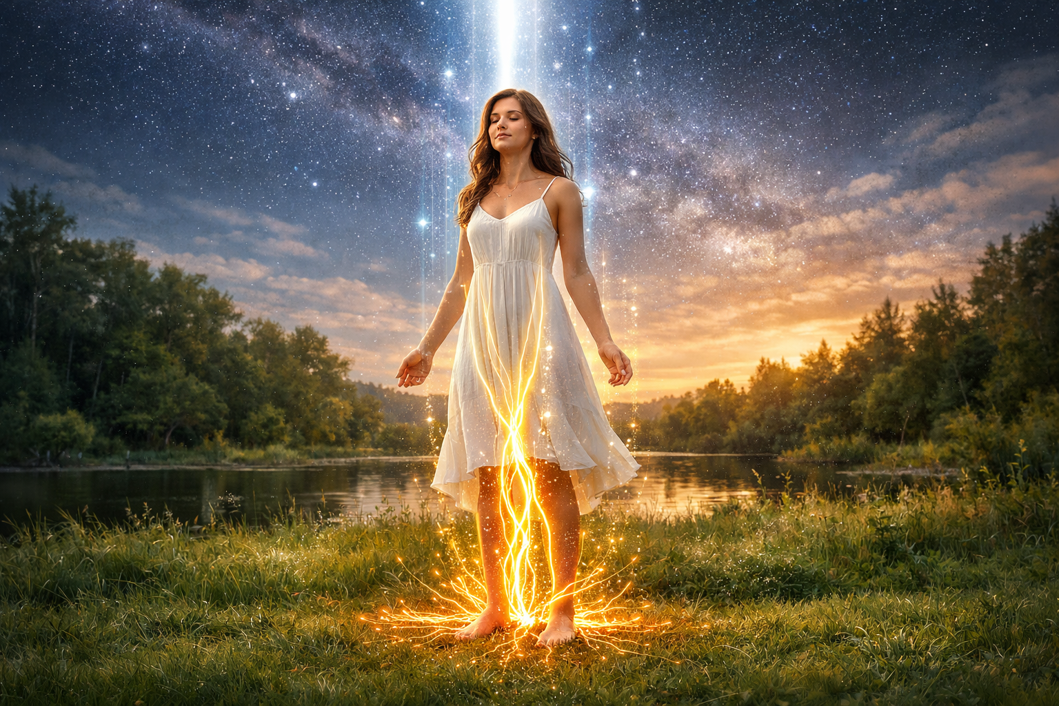5. Представьте, как по этому каналу вверх поднимается энергия Земли. Она проходит через всё ваше тело и выходит через макушку головы в космос.