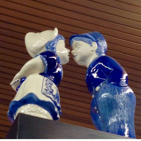 Особенно меня потрясла «сладкая парочка» — две фигурки целующихся мальчика и девочки в национальные голландских костюмах бело-голубых тонов. Сочетание бело-сине-голубой гаммы – это фирменный цвет изделий знаменитой на весь мир фаянсовой фабрики из голландского города Делфт.