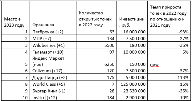 В топ-10 вошли франшизы компьютерных клубов Colizeum и лабораторной диагностики Invitro, до этого не поднимавшиеся до лидерских позиций.