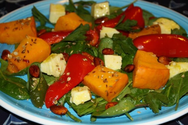 Приготовление: Запеките тыкву и перец при 180°C 15 минут, затем добавьте фету и масло.