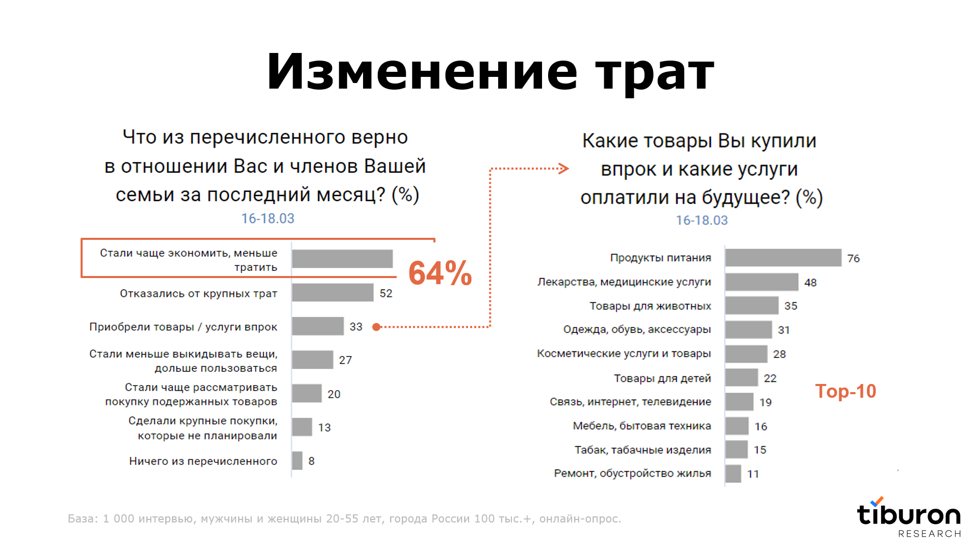 У 65% россиян снизился доход, 64% уменьшили расходы, 33% закупили продукты и другие товары впрок. Такие результаты дало исследование потребительского поведения жителей городов России, проведенное компанией Tiburon Research.