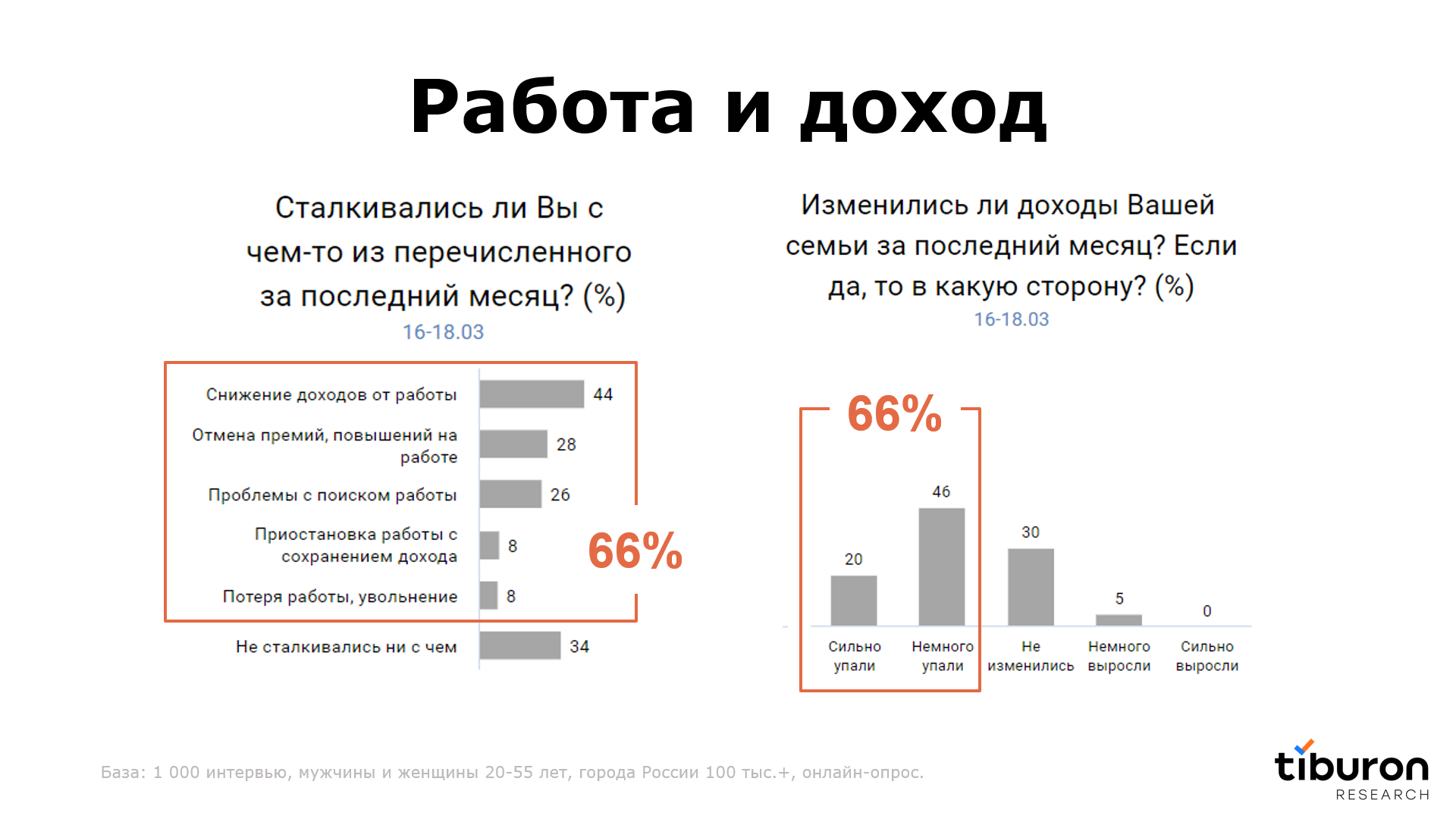 Можно предположить, что через какое-то время, если ситуация не нормализуется, эта группа потеряет работу. 26% отмечают проблемы с поиском работы (34% в Москве), у 28% отменили премии, 44% жалуются на снижение доходов от работы.