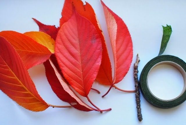 Отсортируйте листья от самых маленьких до самых больших. Один из самых маленьких листочков сложите пополам, яркой стороной наружу. Сверните в маленькую трубочку.