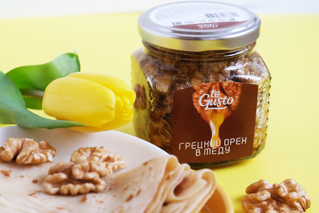 Мёд — издревле любимая добавка к блинчикам. В дуэте с орехами — это сытная и очень полезная начинка. Всем известно, что орехи — источник витаминов и минералов.