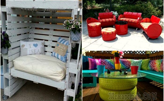 Жестяные бочки — отличный материал для творчества. Используйте их для создания стильных диванчиков, стульев, небольших столиков и тумбочек, которые идеально подойдут для обустройства беседки, веранды или летнего патио.