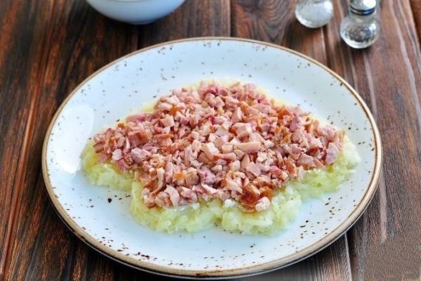 5. Картофель слегка смазать майонезом, выложить на него нарезанную копченую курицу.