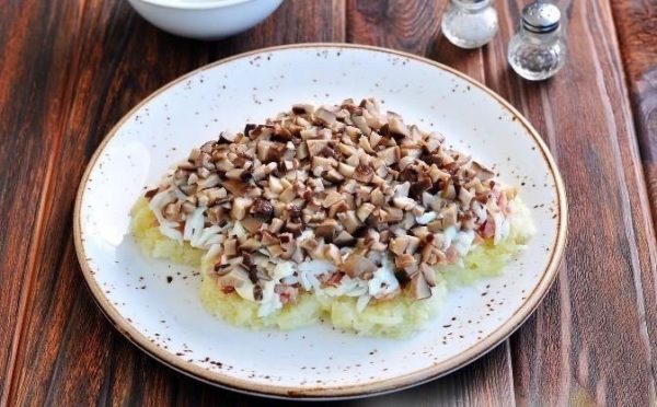 14. Добавить бровки, также вырезанные из маринованных грибов. Блюдо, на котором будет подаваться праздничный салат, можно украсить зеленью укропа. Накрыть пищевой пленкой и оставить слоеный салат с курицей и грибами на время пропитаться.
