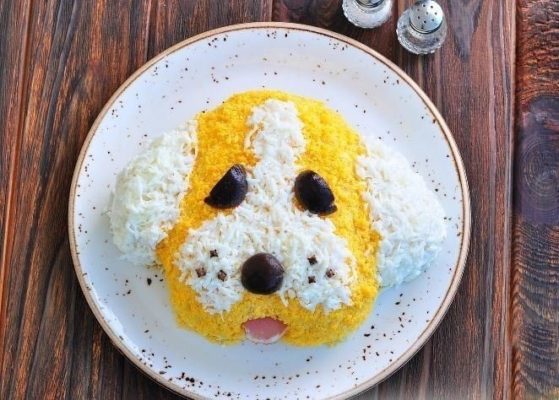 11. Желток натереть на очень мелкой терке, дополнительно измельчить его, чтобы он лучше клеился к слою майонеза. Выложить из желтка мордочку собачки.