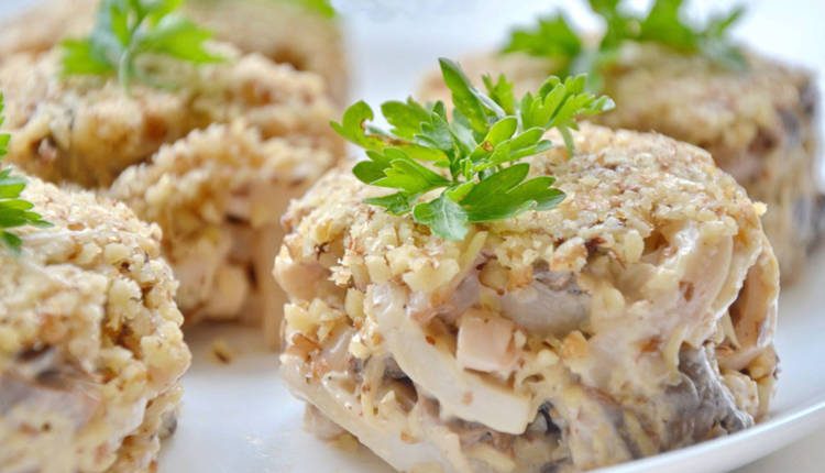 Готовый салат посыпаем измельченными орешками и украшаем зеленью