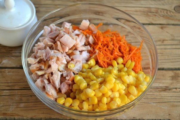 Смещайте нарезанное куриное мясо, кукурузу и корейскую морковку.