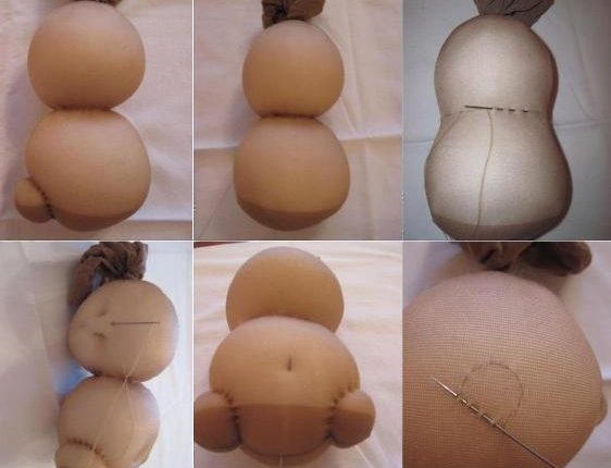 5. Теперь в области шва самих колгот просуньте иголку до животика пупса и захватите немного ниток капрона, чтобы получилась ямка-пупик. Также разделите ягодицы, не отрывая нить.