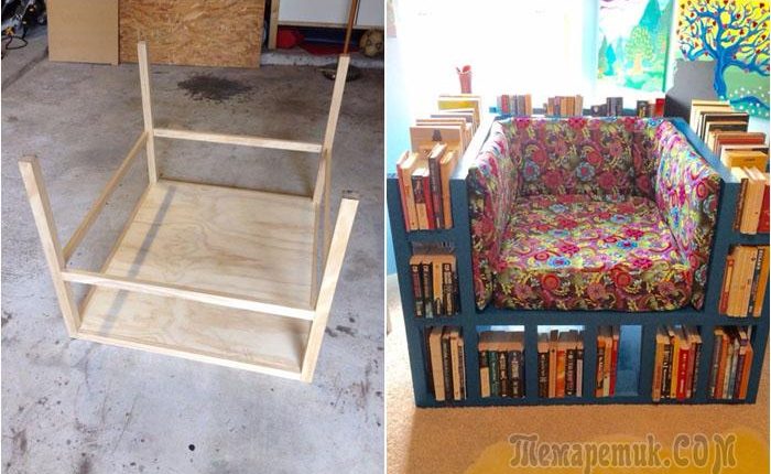 Если есть подушки от старого дивана или кресла, можно воспользоваться ими, чтобы обложить кресло со всех сторон. В противном случае, придется их пошить самостоятельно. Остаётся только заполнить полочки любимыми книгами.