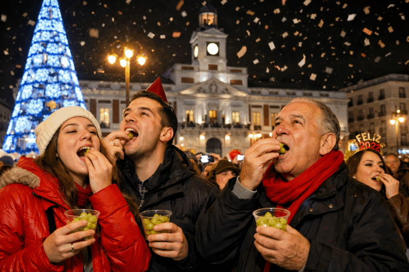 В Мадриде на главной площади Пуэрта-дель-Соль собираются тысячи людей, чтобы под бой курантов вместе проглотить свои 12 символов счастья — не захлебнувшись от смеха.