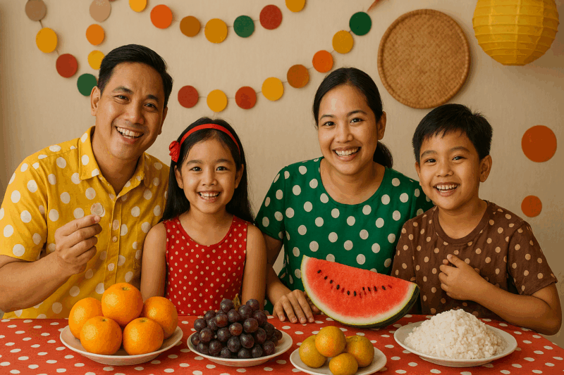 Люди надевают одежду в горошек, на столе — апельсины, арбузы, виноград, даже рис выкладывается горкой. Некоторые филиппинцы даже носят в карманах настоящие монеты, чтобы «звенеть богатством».