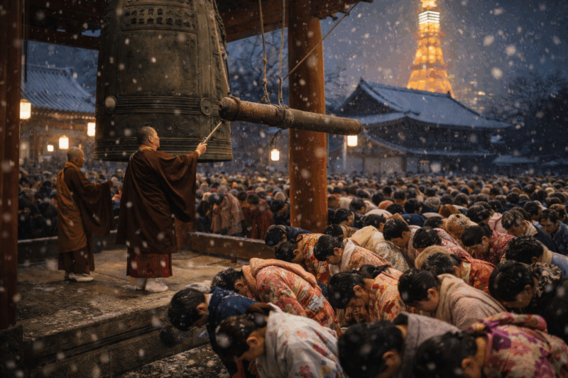 В Японии Новый год встречают тихо и по-философски. В буддийских храмах по всей стране звенят в колокола ровно 108 раз. Это число символизирует 108 человеческих пороков, от которых нужно избавиться. В Токио в храме Дзодзё-дзи тысячи людей собираются, чтобы с первыми ударами колокола начать жизнь с чистого листа. Всё это сопровождается глубокими поклонами, тишиной и снежными хлопьями, падающими в темноту.