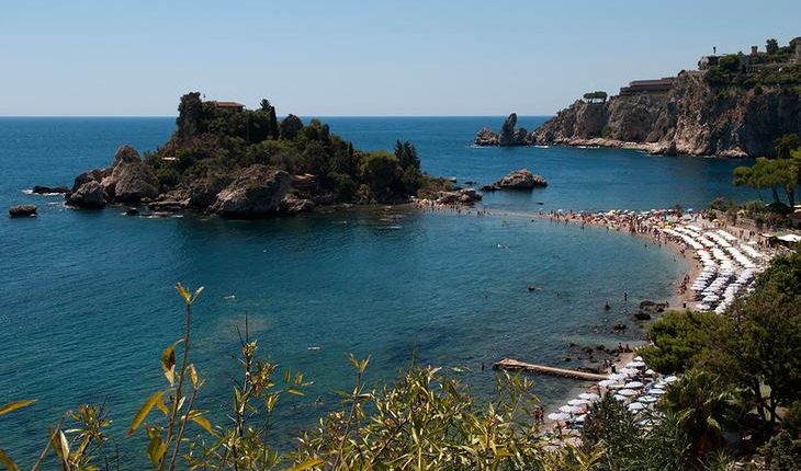 Изола Белла, без сомнения, одно из самых красивых мест Таормины. Это галечный пляж, расположенный у подножия города, напротив одноименного островка, покрытого пышной растительностью. Островок связан с материком узкой полосой пляжа, которую во время прилива покрывает вода.