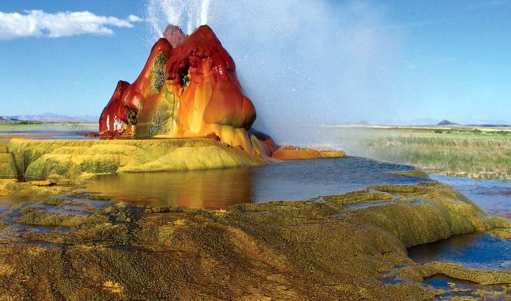 Гейзер появился из-за вмешательства человека. В 1916 году в этом месте пробурили скважину для колодца и пробили геотермальный карман. В 1964 году кипящая вода начала проникать на поверхность, формируя из растворяющихся в воде минералов необычный ландшафт. Стены гейзера продолжают расти и сейчас. Минералы (карбонат кальция), водоросли и цианобактерии придают ему нынешнюю окраску: