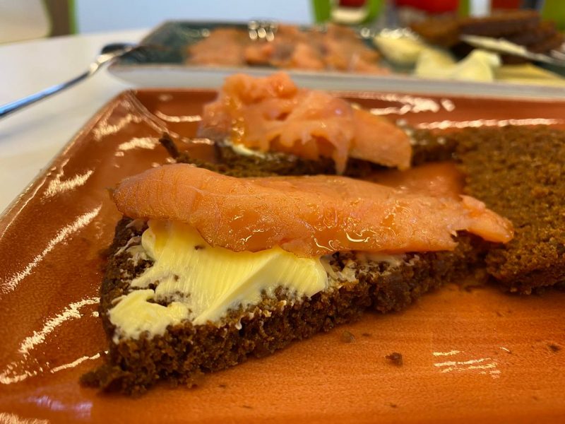 Вытащив буханку из кастрюли, мы нарезали ее ломтиками, намазали куски маслом местного производства и сверху положили кусочки копченой форели, добытой прямо из озера.