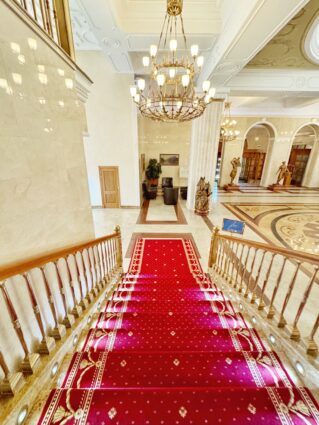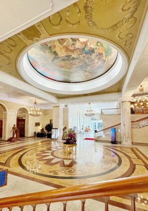 Интерьеры отеля поражали роскошью: вестибюль, отделанный золотой смальтой и порфиром, напоминал алтарную нишу, а уникальная люстра на главной лестнице длиной 15,5 метров даже была занесена в Книгу рекордов Гиннесса.