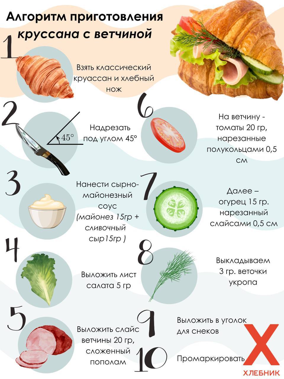 Из классического круассана получаются отличные сытные сэндвичи, в том числе с ветчиной. Приготовим такой сэндвич по рецепту, который используют в сети пекарен Хлебник. Приготовление сэндвича займет до 5 минут вашего времени.
