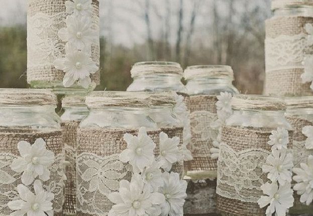 Декорируй банки, используя мешковину и кружево. Как же нежно!