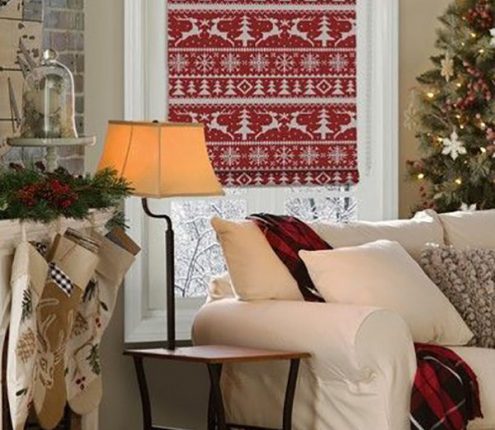 К приближающемуся Новому году можно задать настроение новогодней тканью на римских шторах и декоративными подушками на диване.