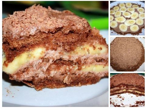 7. И таким образом выкладывать слоями оставшиеся пряники, чередуя их кремовой и банановой начинкой. Постоянно контролировать форму будущего торта, когда выкладываете очередной слой пряников. Посыпать крошкой шоколада.
