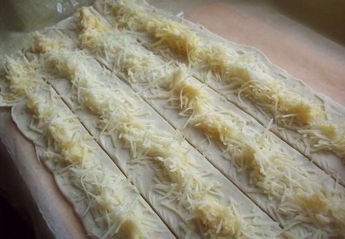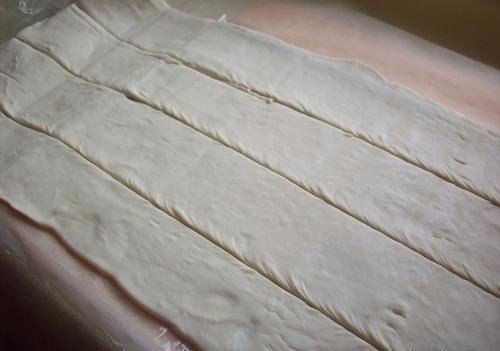2. Тесто разворачиваем, слегка раскатываем. Режем на длинные полоски.