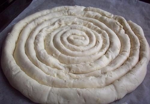 5. Последовательно выкладываем «колбаски» на противень, накрытый бумагой или смазанный растительным маслом, начиная от центра, скрепляя жгутики между собой. Должна получиться “улитка”.