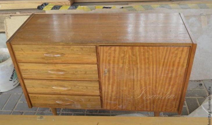 Сразу извиняюсь за ракурс и качество некоторых фотографий: мастер-класс изначально делать не планировала. Уже в процессе работ решила заснять этапы. Так комод выглядел в своей «старой жизни».