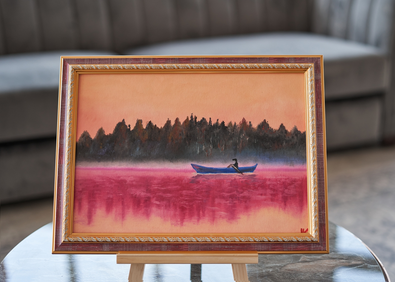 Я ее писала во вдохновляющем состоянии, изображая волшебное утро, человека, который плывет, наслаждаясь происходящим, возможно, на рыбалку. Он находится в гармонии с окружением, не нарушая ее пробуждение, а являясь ее абсолютной частью. Он счастлив, делая каждый взмах веслом, разрезая им туманный воздух, продвигаясь все дальше в сопровождающих его звуках пробудившейся природы.