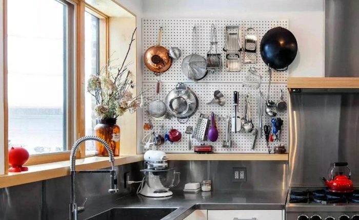 Несколько перфорированных панелей небольшого размера с крючками и полками помогут удобно разместить мелкую кухонную утварь и станет замечательным украшением одной из пустующих стен на кухне.