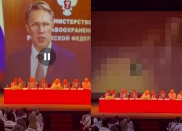 В какой-то момент видео с Михаилом Мурашко прервалось, и на экране появились кадры порнографического фильма. А спустя несколько секунд на экране появились флаг и герб РФ.