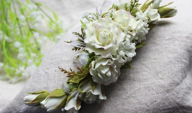 Соберем 2 небольшие веточки с 4 розами, они будут по разным сторонам гребня. 3 крупные розы у нас будут в центре гребня. У этих розочек обрезаем проволоку-основу, она нам больше не нужна.