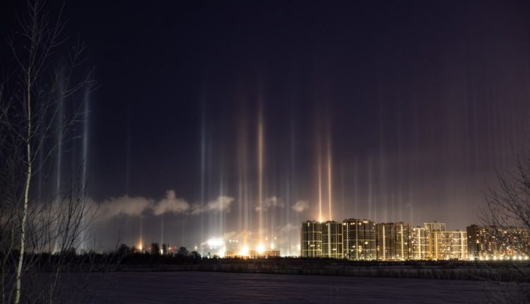 Яркие, красочные столбики светового леса появились вечером на севере СПб. Зрелище удивляющее и завораживающее, не смотря на то, что наблюдается в морозы часто.